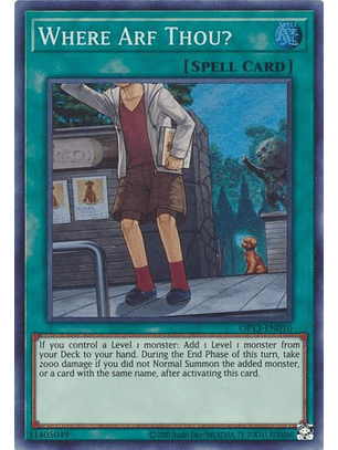 Si controlas un monstruo de Nivel 1 boca arriba: añade a tu mano, desde tu Deck, 1 monstruo de Nivel 1. Durante la End Phase de este turno, recibe 2000 puntos de daño si no Invocaste de Modo Normal al monstruo añadido, o a una carta con el mismo nombre, después de activar esta carta.