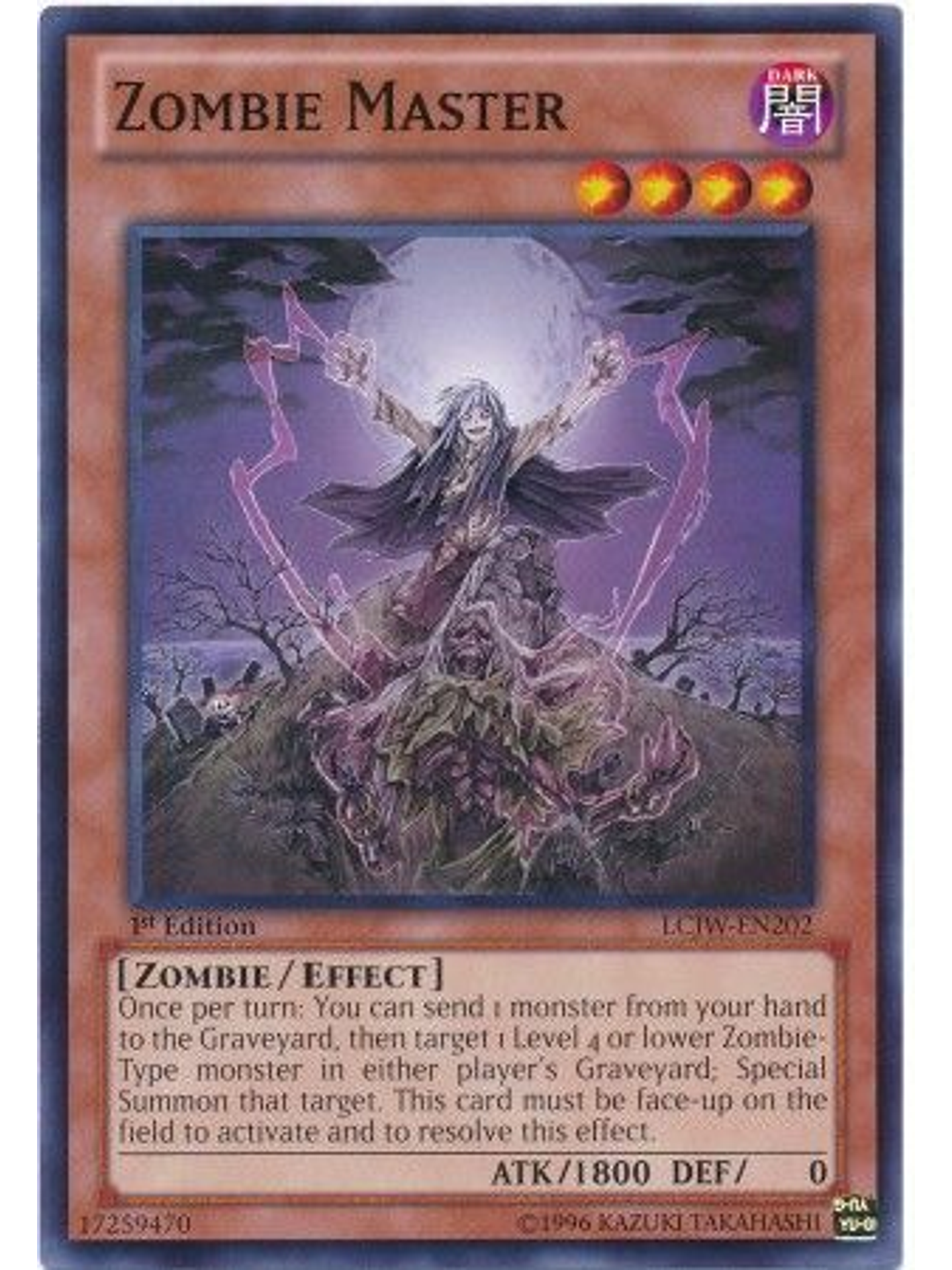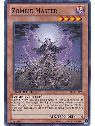 Una vez por turno: puedes mandar al Cementerio 1 monstruo en tu mano, y después selecciona 1 monstruo Zombi de Nivel 4 o menor en cualquier Cementerio; Invoca ese objetivo de Modo Especial. Este monstruo debe estar boca arriba en el Campo para activar y resolver este efecto.